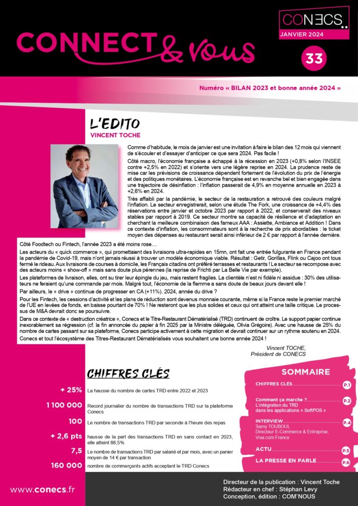 Le mois de janvier touche à sa fin et avec lui, l’année 2024 est maintenant bien entamée. C’est donc très naturellement que votre premier numéro 2024 de Connect & Vous, la newsletter institutionnelle de Conecs, l’opérateur technique des Titres-Restaurant dématérialisés, revient sur l’année passée et les perspectives de la nouvelle.