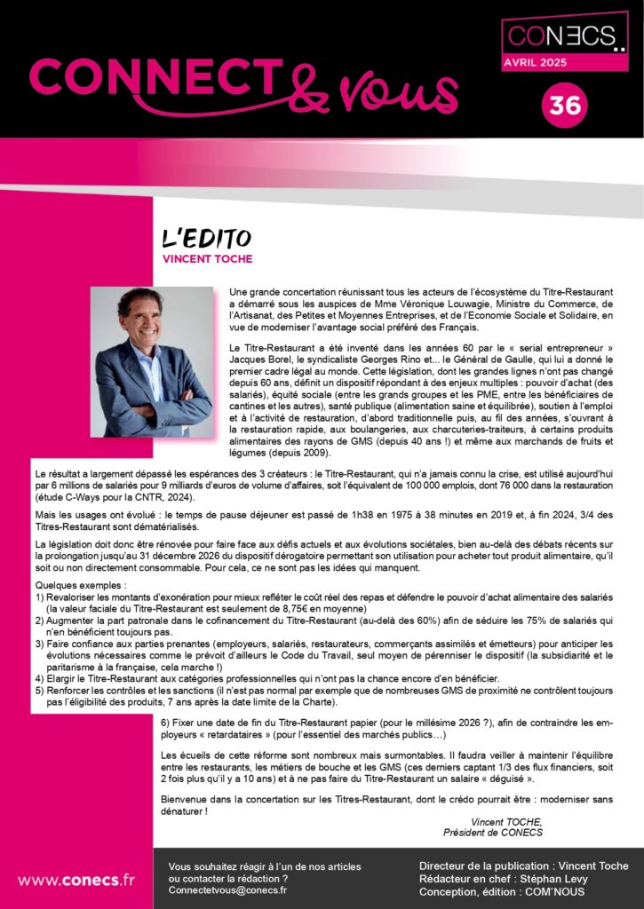 Dans ce numéro, nous donnons la parole aux 2 présidents de Conecs, l’un jeune retraité et l’autre fraichement nommé qui nous détaillera sa vision pour l’entreprise sous sa présidence. A découvrir également dans ce numéro, la riche actualité de Conecs et du TRD ces derniers mois, toutes les explications sur « FRv6 » qui équipe dorénavant la plupart des TPE et bien sûr, toutes vos rubriques habituelles.